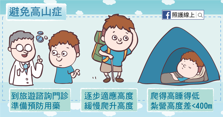 ● 要爬上超過2500以上公尺的山區前,可考慮在略有高度的山區先住宿一晚,隔天再往上爬。攀登3,000公尺以上高山前,應先於海拔2,500公尺左右地區適應高度(約一晚)後再從事登山活動。在高海拔區吃可吃高熱量飲食,喝大量的水,但不要抽菸、不要喝酒。登高山前,事先了解路途會經過哪些山屋,營地有哪些設備,是否需要自備折疊式加壓袋及氧氣瓶也是必做的功課。