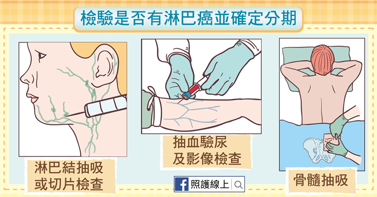若患者因為異常腫大淋巴結而去找醫師檢查時,常常醫師會先投以抗生素治療,看看是否淋巴結會縮小,萬一淋巴結仍然腫大,甚至還繼續變大,就要考慮做切片檢查,取下淋巴結組織放至顯微鏡下檢查。醫師會安排抽血、驗尿來排除感染的可能性。若確認為淋巴癌,則需配合X光、電腦斷層、PET(正子攝影)等影像學檢查確立診斷分期。有時還需做骨髓抽吸或脊髓腔穿刺等侵入性檢查,確認淋巴癌侵犯的程度。