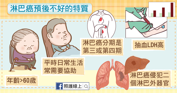 分期雖然重要,但當我們討論存活率時,還要加進更多相關因素。當患者的年齡大於60歲、淋巴癌分期是第三或第四期、淋巴癌侵犯二個淋巴外器官、患者平時日常生活常需要協助、抽血LDH數值高,這五項都代表著預後比較不好的特質。如果完全沒有符合以上的這些條件,那預後就會很不錯,95%的患者能活至少四年;如果五項中符合三項以上的條件,預後並不好,只有55%的患者能活滿四年。