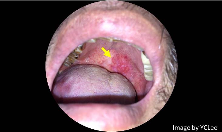 下圖是上顎紅斑,紅斑是需要謹慎評估甚至完整切除檢查,因為研究顯示紅斑的危險性較高,圖中患者接受了紅斑的完整切除手術,病理檢查結果為原位癌(carsinoma in situ),切除邊緣無細胞變異,但是手術後還是建議要在門診追蹤檢查。