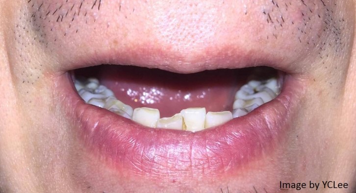 口腔黏膜下纖維化在嚴重時會有張口困難(trismus),因為口腔黏膜已經因為纖維組職而硬化,難以張口,下圖就是患者能張口的極限,當然也會因此影響進食。