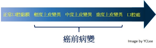 口腔癌的形成是一個漸進的過程,正常口腔黏膜可能發展成有細胞變異的癌前病變,再進一步變成口腔癌,所以如果本身有常吸菸或嚼檳榔的習慣,又在口腔中發現白斑、紅斑及或癌前病變時,就應該要注意了!