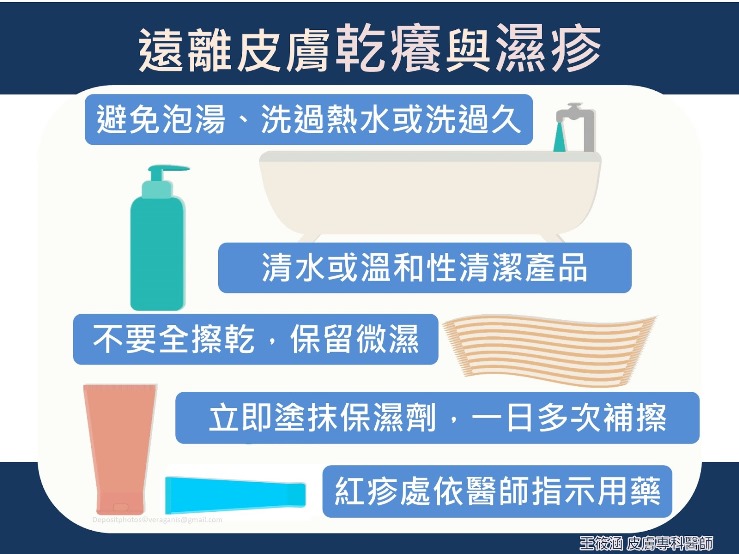 ● 癢了就抓,越抓越嚴重:癢起來不抓真的很難受,但搔抓這個動作只會讓皮膚狀況惡化,建議搔癢時勤擦保濕劑或是冰敷,並且及早接受治療。