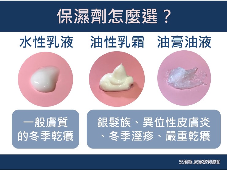 一般膚質或油性肌膚使用水性保濕乳液(Lotion)就可以對付乾癢問題,但中老年人、乾性膚質、異位性皮膚炎等族群的冬季乾癢和濕疹,是需要使用同時能吸水和鎖水的油性保溼乳霜(Cream)或油膏(Balm)、凡士林(Ointment)和嬰兒油(Oil)等,早上、午後、洗澡後、睡前一天數次,對於嚴重乾癢者保濕次數不嫌多。