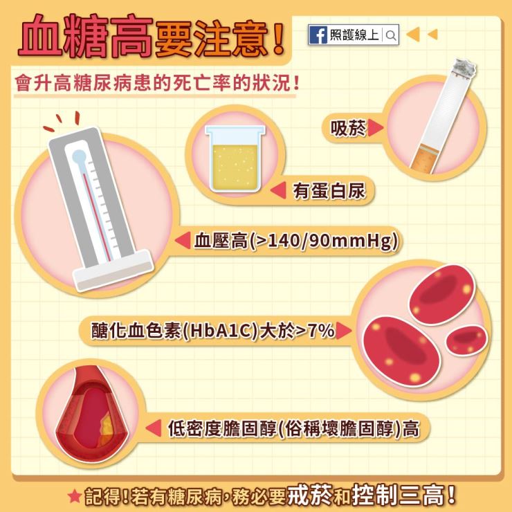 你可以閱讀「高血糖的前奏–糖尿病前期」這篇文章,更了解高血糖的致病機轉,也可以閱讀如何用「運動」、「飲食」、「藥物」、和「戒菸」等方式更理想地控制血糖。為了健康,我們一起加油!