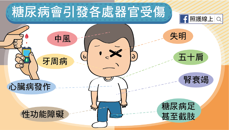其實糖尿病對全身上下都會造成不好的結果,尤其血糖會影響全身上下的血管健康。當血管受損,自然就會引發各處器官的損害。