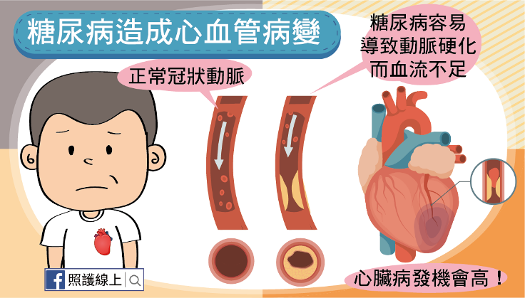 糖尿病會造成血管壁慢性發炎、受傷、血小板聚集、而導致動脈粥狀硬化,血管壁的通暢度變少,就像是高速公路全部從原本的四線道,逐漸限縮成一線道,很容易造成大塞車那樣,當動脈硬化血管變窄之後,血液的流動自然會受阻礙。