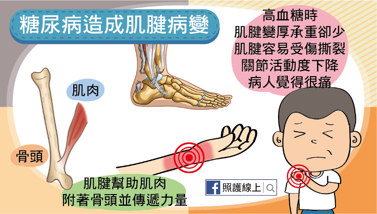 肌腱位在肌肉末端堅韌的結締組織,幫助肌肉附著到骨頭上。肌肉收縮時,肌腱能傳遞力量,幫忙帶動骨頭、移動位置。肌腱是由膠原纖維組成,膠原纖維是一種蛋白質,當血液中是高血糖的狀態時,糖分會附著上蛋白質,肌腱的膠原纖維當然也會高糖分纏上,肌腱型態變厚,但能承受的重量卻變少了,造成肌腱容易受傷而產生撕裂傷,患者容易因為肌腱受傷而感到疼痛,關節的活動度下降