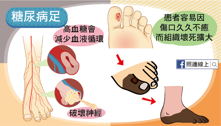 糖尿病足這樣非常常見的問題,其實是由兩分面進行破壞的。糖尿病會破壞周邊神經,因此患者對冷、熱、痛的感覺就愈來愈不敏感,很容易受傷,很多患者即使是腳被割到了、流血了、或有些小傷口,卻仍不知道,很容易放到傷口狀況惡化及感染才發覺。另外,糖尿病造成血管狀況不好的話,傷口癒合就會變慢,引發傷口變成潰瘍及壞疽的機會就升高了。