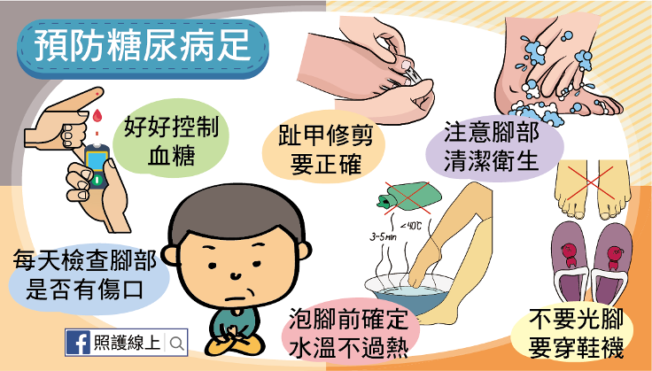 想要避免糖尿病足,記得好好控制血糖是必須的,才不會導致神經病變和血管病變。平常每天要注意檢查腳部有沒有什麼傷口,也要檢查趾甲的修剪方式,清潔時先用手肘處測量水溫,免得腳的感覺不夠敏銳,後來泡腳反造成腳的燙傷!要穿包鞋及襪子,即使在家也盡量別光腳活動。
