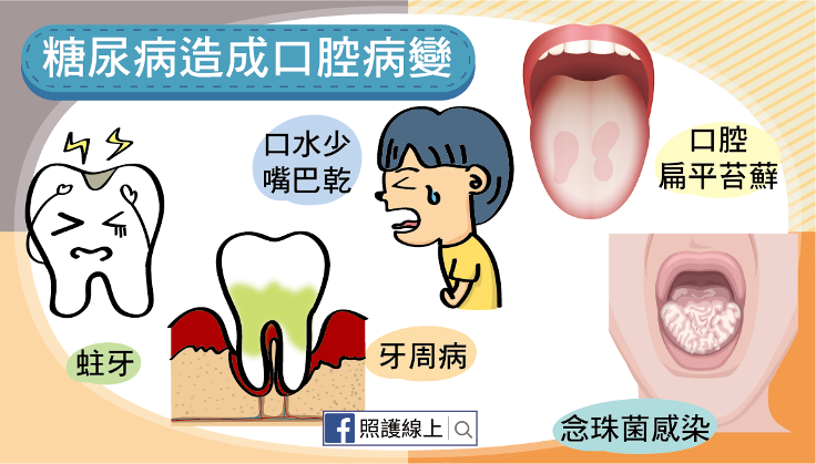 最後我們要提醒糖尿病患者注意包含牙齦、牙齒、舌頭等部位的口腔衛生。口水是身體分泌物的一種,血糖高的話,口水含的糖份就高,口腔內就更容易孳生細菌與牙菌斑,引發蛀牙及口氣差。大規模的統計報告證實,糖尿病患者口腔內的傷口較難癒合,口腔感染機會增加,同時容易牙齦紅腫、流血,也更容易有牙齦退縮、牙齒搖晃、咬合改變等問題。因此糖尿病患者更要記得半年一次的口腔檢查,確定自己是否有牙周病或其他口腔問題,並及早做好防範措施。