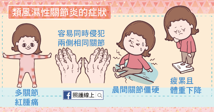 患者發病後可能於早晨起床時,或坐了很久沒活動後,就會感覺到關節僵硬。還可能覺得愈來愈疲累,體重莫名其妙地下降,有時有點微微的燒,台語說「夯夯」這樣,但不至於發高燒。