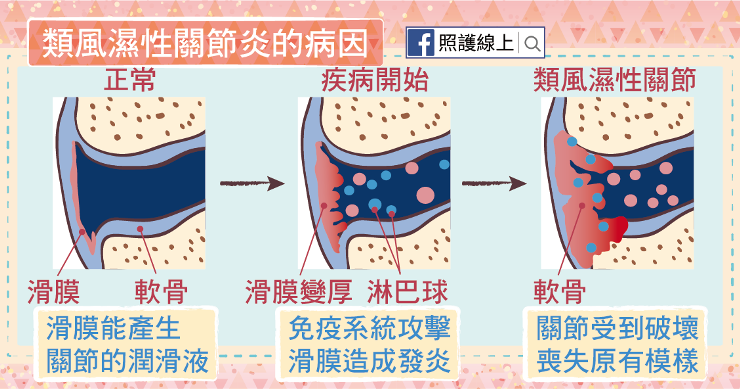 至於為什麼會有這樣的疾病呢?原來是我們自身的免疫系統出了錯,開始攻擊關節的滑膜。滑膜的功用在於產生關節的潤滑液,增加關節的活動度。當免疫系統的細胞從血液跑到關節滑膜去包圍、啟動攻勢後,會讓滑膜反覆發炎、變得更厚,到後來會逐步破壞關節附近的軟骨與硬骨,更使關節附近的韌帶變弱,關節喪失原有的形狀。患者因而感覺到關節疼痛與紅腫。(若為退化性關節炎,問題則出在硬骨與硬骨之間的軟骨被磨損殆盡,與分泌潤滑液的滑膜就沒什麼關係。)