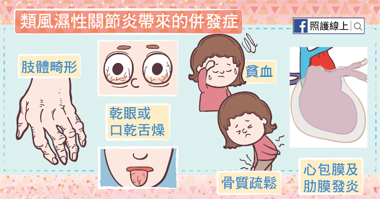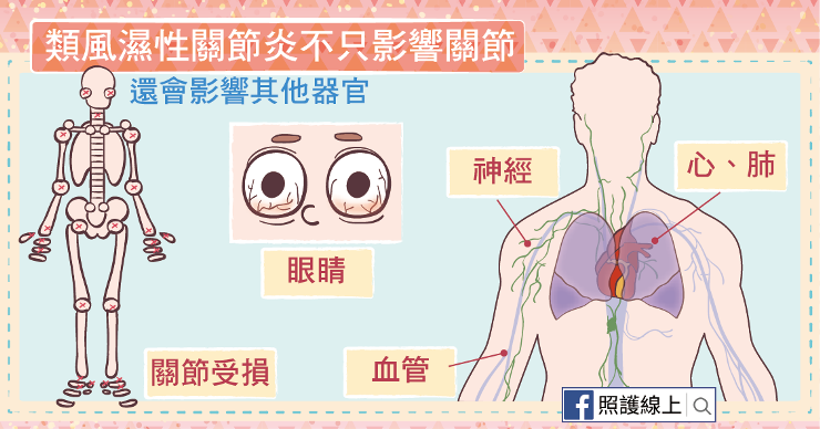 除了關節與皮膚外,類風濕性關節炎還可能侵犯眼睛、心臟、肺臟、血管、腎臟、唾液腺、神經組織、與骨髓等多樣器官組織。類風濕性關節炎讓眼睛及口腔的潤滑液分泌減少,造成乾眼或口乾舌燥,也會讓眼白鞏膜處發炎,讓眼睛疼痛發紅。類風濕性關節炎患者的免疫系統也會去攻擊紅血球,導致貧血,但同時血小板的數量卻異常上升,增加血栓生成,而提高了中風、心臟病發等疾病的發生機率。我們的心臟外包著一層組織,叫做心包膜,類風濕性關節炎會造讓心包膜發炎、增厚變緊,而影響到心臟的跳動。類風濕性關節炎同樣會使肺臟外的肋膜發炎,讓患者每一次呼吸都感到疼痛。另外,類風溼性關節炎的疾病本身,與其治療用藥,都可能增加骨質疏鬆的風險,患者骨折的機會就變高了!