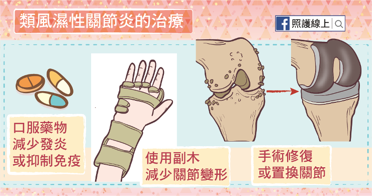 若確定是類風濕性關節炎的時候,醫師可能會先開立非類固醇消炎藥(NSAID)或類固醇等藥物減輕疼痛和減少發炎反應。疾病調節抗風濕藥物disease-modifying antirheumatic drugs (DMARDs)能透過免疫調節的方式控制關節發炎,抑制免疫系統攻擊自身關節的程度。目前也有生物製劑能輔助治療。患者平時可使用副木、支架支撐肢體,減少關節變形的機會。手術在治療類風濕性關節炎方面也有角色,當關節已被破壞到變形嚴重,就要用手術修復、置換、融合,重建關節樣貌。