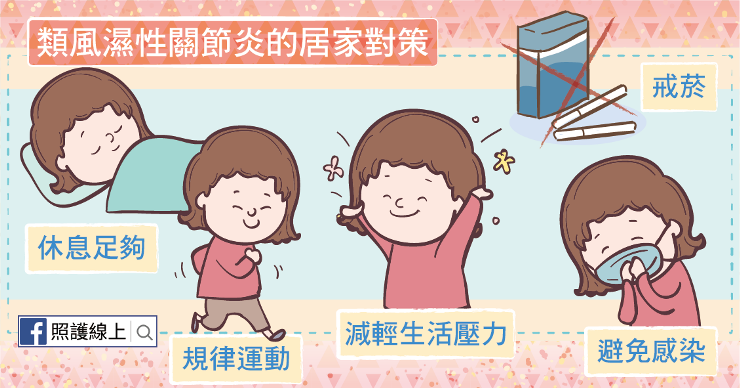 目前沒有治癒類風濕性關節炎的方式,患者症狀可能像坐雲霄飛車般,有高有低,前幾天還感覺很不錯,過沒多久突然關節又開始僵硬。因此,休息與規律運動都很重要,患者也可考慮在運動前先熱敷關節,並在運動後做冰敷,或幫關節做冷熱敷交替。另外,細心觀察與症狀發作可能相關的因素,會減少患者發作的機會: