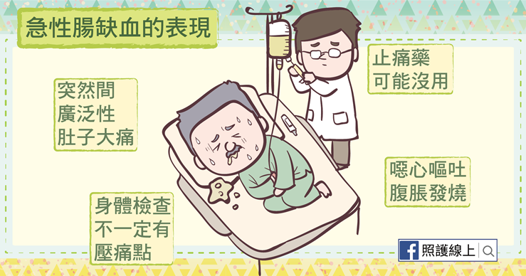 急性腸缺血患者會有突然之間、廣泛性、持續性的肚子大痛,而且痛的程度與身體檢查結果並不成正比。這句話是什麼意思呢?就是說患者一直喊肚子很痛,但在一旁的親友問說哪裡痛,或幫忙按壓肚子時,不一定有特別痛點,甚至壓一壓還不會有壓痛。但患者就是抱著肚子一直叫,說不上來哪裡最痛。甚至到了醫院打止痛藥,還可能沒效,肚子繼續痛。隨時間過去,症狀愈來愈嚴重,患者還會有噁心、嘔吐、肚子脹、發燒、血便等症狀。年紀大一點的人,還會開始神智不清。