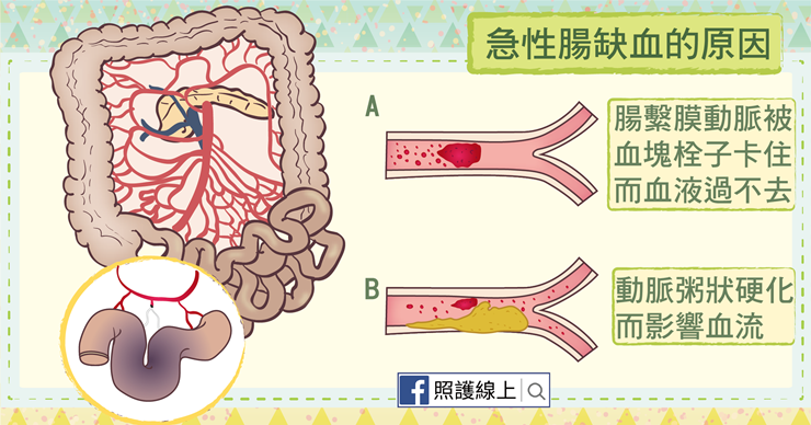 小腸與大腸的血流供應主要來自「上腸繫膜動脈」與「下腸繫膜動脈」的分支,靜脈則多半隨著動脈而行。急性腸缺血發生的位置可以是發生在「動脈」或「靜脈」。問題發生於動脈的患者較多,又可細分成「有阻塞型」和「非阻塞型」。