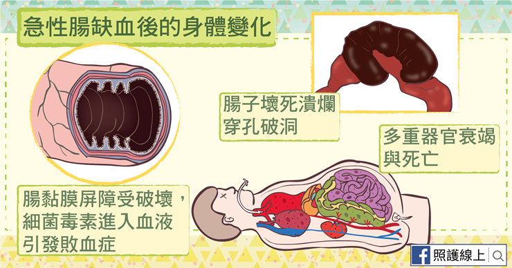 如果是急性腸缺血的話,患者死亡率高達七成;若腸子已經缺血到壞死、破洞後,這時就很容易引發敗血症休克、多重器官衰竭、以及死亡。死亡率可達九成,預後非常差。
