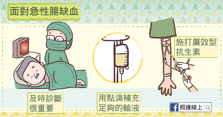 確診為急性腸缺血之後,要替患者輸注足夠的水分輸液,並用上廣效性抗生素對抗細菌。
