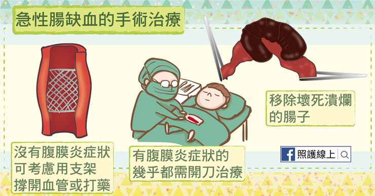 接下來,急性腸缺血幾乎都需要用手術解決。只要有腹膜炎症狀的,或已有敗血症懷疑腸子黑掉的,都要開刀!