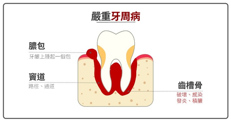 因為感染源堆積在牙齒周邊,所以牙齒周邊的牙齦因為發炎而紅腫、化膿、長膿包。