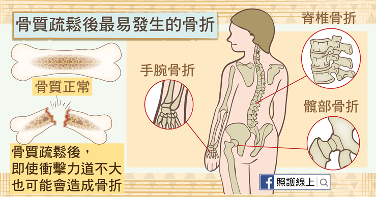 然而當年紀大、骨質疏鬆後,骨頭的密度不夠,可能只是一個跌倒,一個扭傷,就造成骨折!據統計,骨質疏鬆造成的骨折,最容易出現在脊椎、髖部、和手腕這幾處。