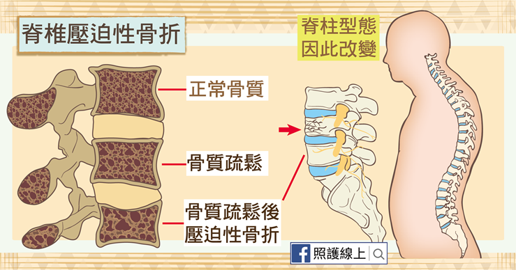 我們先從發生在脊柱的「壓迫性骨折」談起,脊椎骨這樣一節一節地往下壓,骨質疏鬆厲害的部分就被壓到垮掉,然而剛開始時患者通常沒有症狀,但脊椎骨一個個變得愈來愈扁平,脊椎骨之間的間距變小,脊柱的型態也就變形了,老人就會看來駝背更加嚴重。