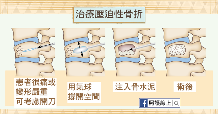 手術通常是替壓迫性骨折的脊椎骨打入骨水泥,加強這塊骨頭的強健程度,在打入骨水泥之前,可以考慮先用氣球撐開被壓垮的脊椎骨空間。研究認為有先用氣球撐開脊椎骨空間的方式可能會帶來較持久的好處。