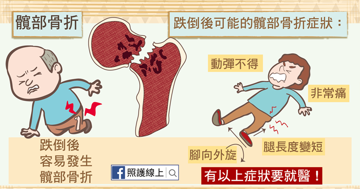 那為什麼會髖部骨折呢?老人萬一跌倒,就很容易是造成髖部骨折,甚至有些患者骨質疏鬆很嚴重,只是想要從椅子上坐起身,站起來,一個用力也就髖部骨折了。假如老人跌倒、或起身之後,開始抱怨髖部疼痛,動作變的不靈活,無法行走,或是倒在地上腳向外旋,就要擔心是髖部骨折。