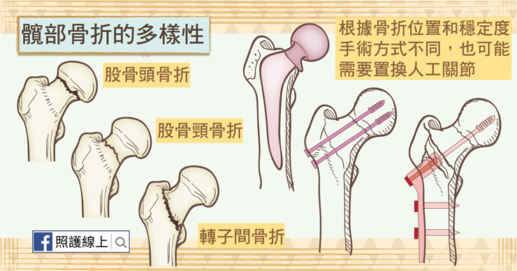 髖部這裡的骨折會因為骨頭斷掉位置不同,分成不同的類型,像是股骨頭骨折,股骨頸骨折,和轉子間骨折。股骨就是大腿骨,是人體最長的骨頭,最上端是呈現一個圓球狀,卡在髖關節內。不管是哪個類型,除了少數例外,髖骨骨折幾乎都需要手術治療。