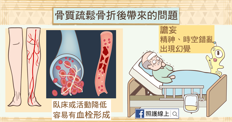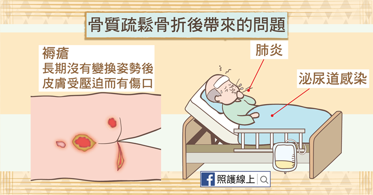 感染在老人骨折之後,也是如影隨形。因為骨折後讓患者活動力下降,甚至需要臥床休息。患者容易因為怕痛,每個動作都小心翼翼,呼吸的動作放得很輕,比較排不出痰或髒汙,後來就容易產生肺炎。骨折之後不管是臥床包尿布的患者,或是裝置導尿管,長期下來產生泌尿道感染的機會也比一般人高,常因為一個發燒,又要進醫院治療找原因。