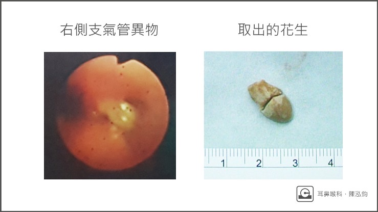 掉到小孩支氣管的異物中,以食物居多,而多年來穩居排行榜第一名的就是「花生」!花生真可說是「小孩呼吸道殺手」,為什麼呢?各位可以想像一下花生的構造,外表光滑、吸了水後會膨脹,還可能一分為二,同時卡住兩邊的支氣管,讓呼吸道完全阻塞而窒息。這麼一想,真是令人毛骨悚然!