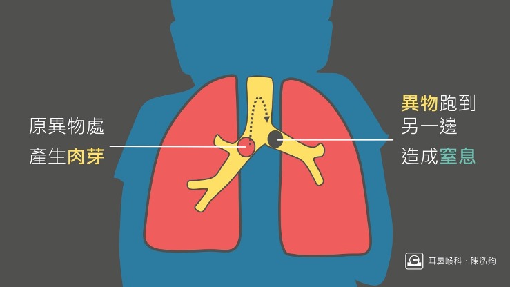 但若是卡在「支氣管」的異物,利用拍背的方式不但很難咳出來,還可能讓異物掉得更深、卡得更緊。此外,若原本卡住異物的支氣管已被肉芽塞住,而異物又「跳」到另外一邊的支氣管,小孩子就可能從上一秒還能活蹦亂跳,一下子就窒息缺氧,相當危險。