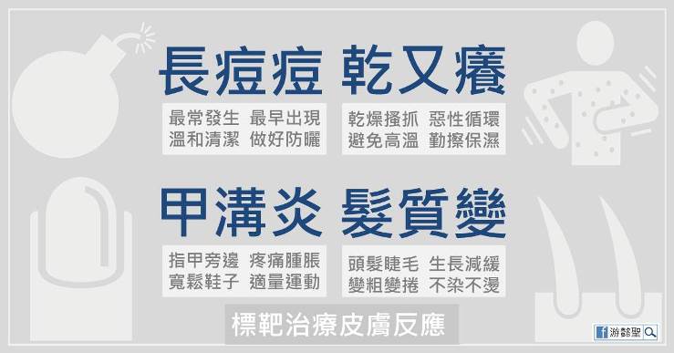 針對癌症標靶治療造成的皮膚副作用,台灣皮膚科醫學會在參考國外文獻報告、國內專家治療經驗分享之後,發表了治療共識,主要的皮膚副作用有:痘狀皮疹、皮膚乾燥、皮膚癢、甲溝炎、黏膜發炎、以及頭髮變化等六種;我把其中比較常見的幾個變化,歸納成四種表現:長痘痘、乾又癢、甲溝炎、髮質變。