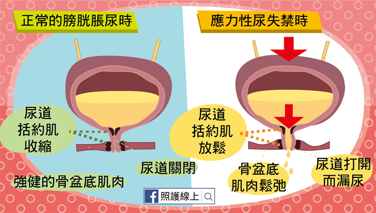 應力性尿失禁(stress urinary incontinence)常起源於下泌尿道、骨盆底的肌肉鬆弛。當尿道括約肌的力道不足,「hold不住」,當肚子壓力增加的時候,膀胱受到壓力就開始「釋放」裡頭的尿液,當然會造成漏尿的意外。於是這種應力性尿失禁經常發生於患者捧腹大笑、咳嗽、運動、或上大號時,是女性最常見的尿失禁種類。