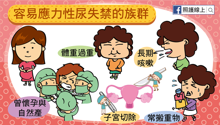 曾經懷孕及自然產的婦女,子宮切除的女性,體重增加或肥胖的女性,或常常需要搬重物、年紀大的女性比較容易發生骨盆腔底部肌肉鬆弛的情形,應力性尿失禁的機會就比較高。有些人的應力性尿失禁起源自疾病,像是長期抽菸引發慢性支氣管炎,容易長期咳嗽,因而出現漏尿的狀況。
