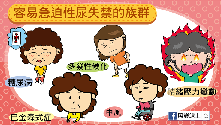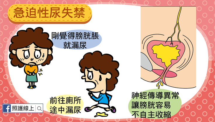 在沒有預期的狀況下解尿,不自主地流出小便。或在已經在前往廁所的半途,卻仍控制不住先小解一番。