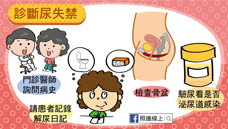 因此若女性朋友們有尿失禁的症狀,可以找婦女泌尿的醫師評估。醫師可能會先聽患者敘述尿失禁發作的事件經過,並建議有尿失禁困擾的患者,先試著紀錄「解尿日記」。患者會領到解尿日記的表格,自己就於平日詳實地紀錄自己在何時喝多少水,小便的量又是多少,白天與晚上各上了幾次廁所,漏尿時做了什麼活動,漏尿量有多少,是否有感到急迫感。這樣詳實地記錄至少三到四天,醫師能更完整評估患者屬於哪種的尿失禁。