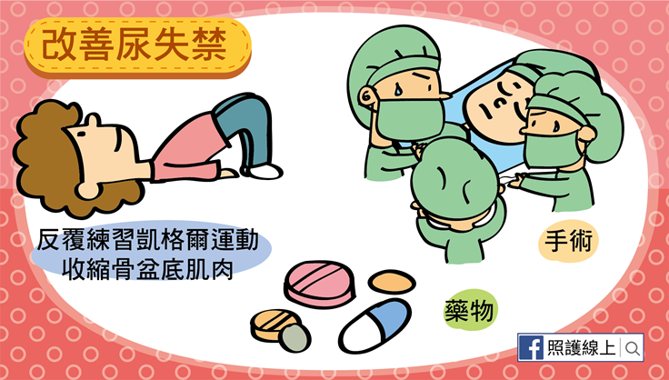 確定診斷之後,醫師就能選擇治療方式,改善患者的尿失禁。記住,尿失禁不是年紀大婦女的必然,許多女性都能從各種治療後得到好處且改善症狀。像是患者可以先和醫師研究目前服藥,看看是否有用利尿劑或抗憂鬱劑等容易導致尿失禁的藥物,以及是否需要調整。