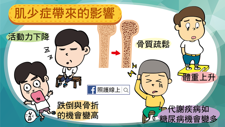 據統計,到年齡六十歲的時候,約有三成的人患有肌少症,而到了八十歲的銀髮族則有一半以上都患有肌少症。可別小看這個問題,當肌肉的質與量變少,代表的就是我們連日常生活中常需要的「走路」這個動作,都受到影響。一個人若走路顫巍巍地,就變得更脆弱,跌倒或骨折的機會變多。活動力下降的同時,也會影響骨質變差,更容易骨質疏鬆。而且這很容易變成一種惡性循環,想想看萬一骨折後,我們的活動力又會再下降,很容易讓體重上升。肌肉比例降低後,會引發代謝問題,體內胰島素的感受性比較低,無法有效地降低血糖,因此有些患者雖然不到肥胖程度,但罹患糖尿病的機會卻又升高。最後,反覆的無力、跌倒、骨折會讓人失去生活獨立自主的能力,凡事都需要有人照料著才有辦法生活。