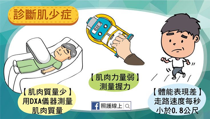 至於要怎樣診斷肌少症呢?第一要點是符合「肌肉質量低」,再配合上「肌肉力量低」,及(或)「體能表現差」。這三個項目,我們分別會用以下的方式檢測: