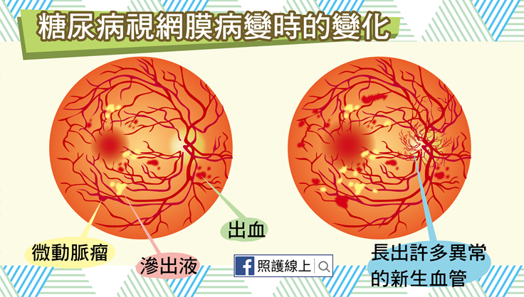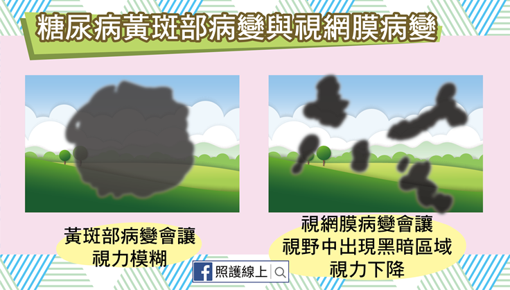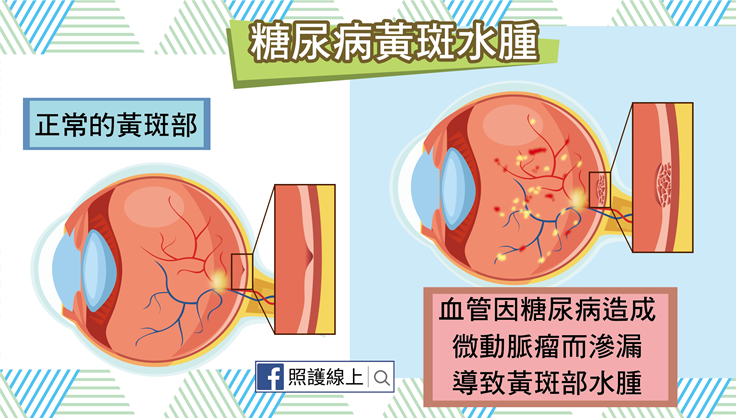 過多血糖會損害眼睛視網膜區域的微小血管,從血管壁突出成微小凸起,讓血管上遍布著變形膨大的「微動脈瘤」,這時血液會滲進到視網膜中,導致視網膜中央的黃斑部腫脹、水腫,稱為糖尿病性黃斑水腫,可以是局部性,也可能會是瀰漫性,讓患者看東西時焦點變模糊,畫面浮動。