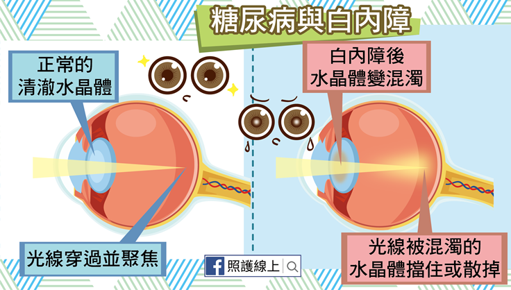 很多人在年齡增長時,都會飽受白內障困擾。但白內障的發生也與糖尿病有關!白內障問題出在原本清澈的水晶體變得混濁,光線透不過水晶體,難以成相於視網膜上。而我們的水晶體需從水狀液體獲取營養和氧氣,血糖過高的時候,水晶體會變得腫大,且會累積一些影響清晰度的物質在水晶體內,讓水晶體更混濁,當然就影響到患者視覺的清晰程度,讓患者視線模糊變形,總是霧裡看花,然而色調還褪色成褐色黃色色調呢!