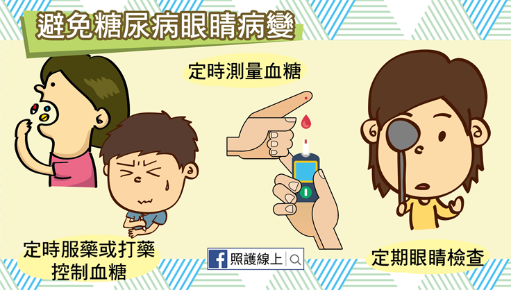 看到這裡,大家應該能夠了解,避免血糖一直處在過高的狀態,才能讓血管健康,讓我們的眼睛組織獲取足夠的氧氣養分。因此想要避免糖尿病帶來嚴重的眼睛併發症,最要注意的是:「定時服藥控制血糖、定時測量血糖、定期眼睛檢查」。