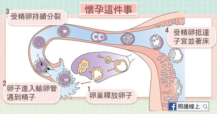 卵巢釋放卵子後,卵子進入輸卵管,過程中遇上精子,結合成受精卵,受精卵會繼續在輸卵管內待個三到四天,再進到子宮著床發育,直到胚胎成長為寶寶。