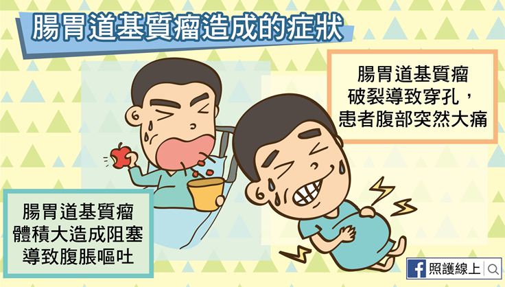 而萬一長的太大的腸胃道基質瘤破裂了,可能就此造成腸胃道穿孔,患者腸胃道裡面的消化液、食糜流往腹腔,引發腹膜炎,患者會肚子大痛。