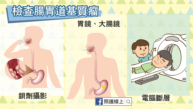 患者因為上述等腸胃道症狀就醫檢查時,醫師會安排鋇劑檢查、胃鏡、大腸鏡、或電腦斷層等影像學檢查,進而發現腸胃道基質瘤。