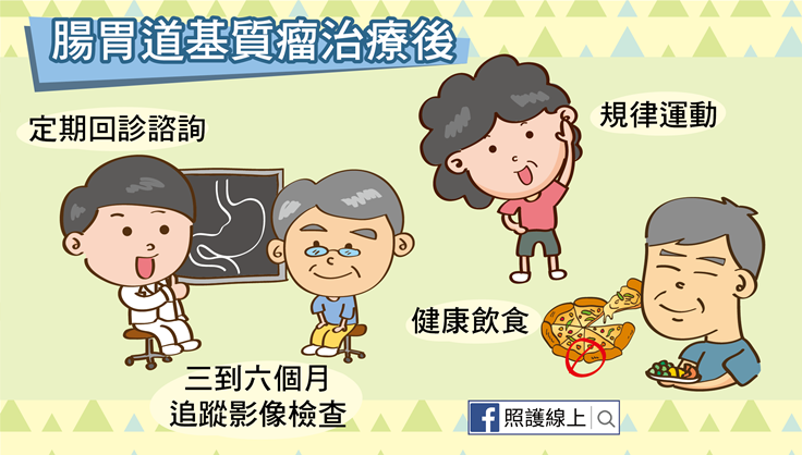 經過治療之後,腸胃道基質瘤的患者仍需要定期追蹤檢查,讓醫師了解患者最近的生活情況,是否有腸胃道症狀,並在三到六個月之間追蹤影像檢查,看看是否有腫瘤復發的證據。罹病和治療過後,患者最好要養成慎選食物、規律運動、與控制體重這些好習慣,才能增進整體的健康狀況。
