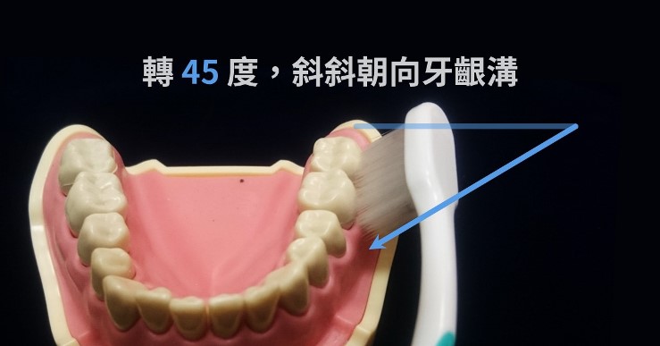 ● 牙齒外側、及內側:牙刷的刷頭,轉 45 度朝向牙齦溝的位置。